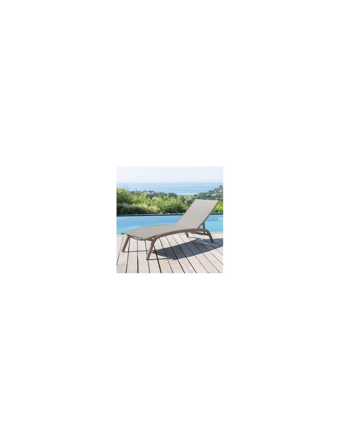 2 roues - Aluminium traité époxy, TexalineL. 196/201 x P. 80 x H. 36/99 cmLargeur d'assise : 63-71 cmMatiére de la structure :AluminiumMatiére de l'habillage :Polyester enduit PVC (Texaline)é monter soi-mémeNombre de positions :5Roues incluses :OuiEmpilable :OuiTraitement antirouille :OuiPoids :8,5 kgGarantie 2 ansInfos +Appuie-téte vendu...