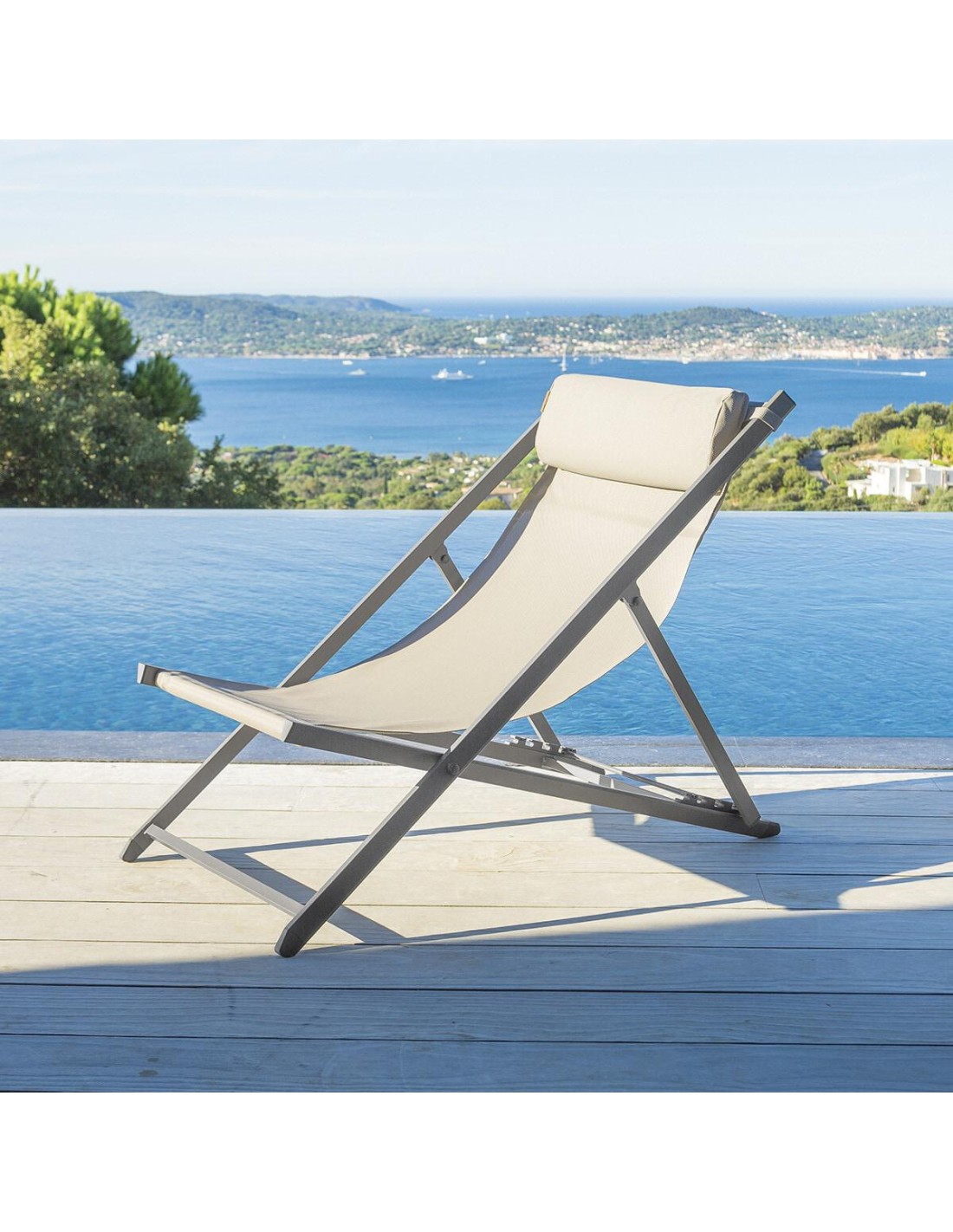 DimensionsL. 63 x P. 109 x H. 86 cmDimensions produit plié : L. 62 x P. 9 x H. 134 cmMatiére de la structure AluminiumMatiére de l'assise Polyester enduit PVC (Texaline)é monter soi-méme NonNombre de positions 4Grammage toile 580 g/méRésistance é la décoloration OuiEmpilable NonPliable OuiPoids 6,9 kgGarantie 2 ans OuiNombre de colis 1DimensionsL. 63 x P....