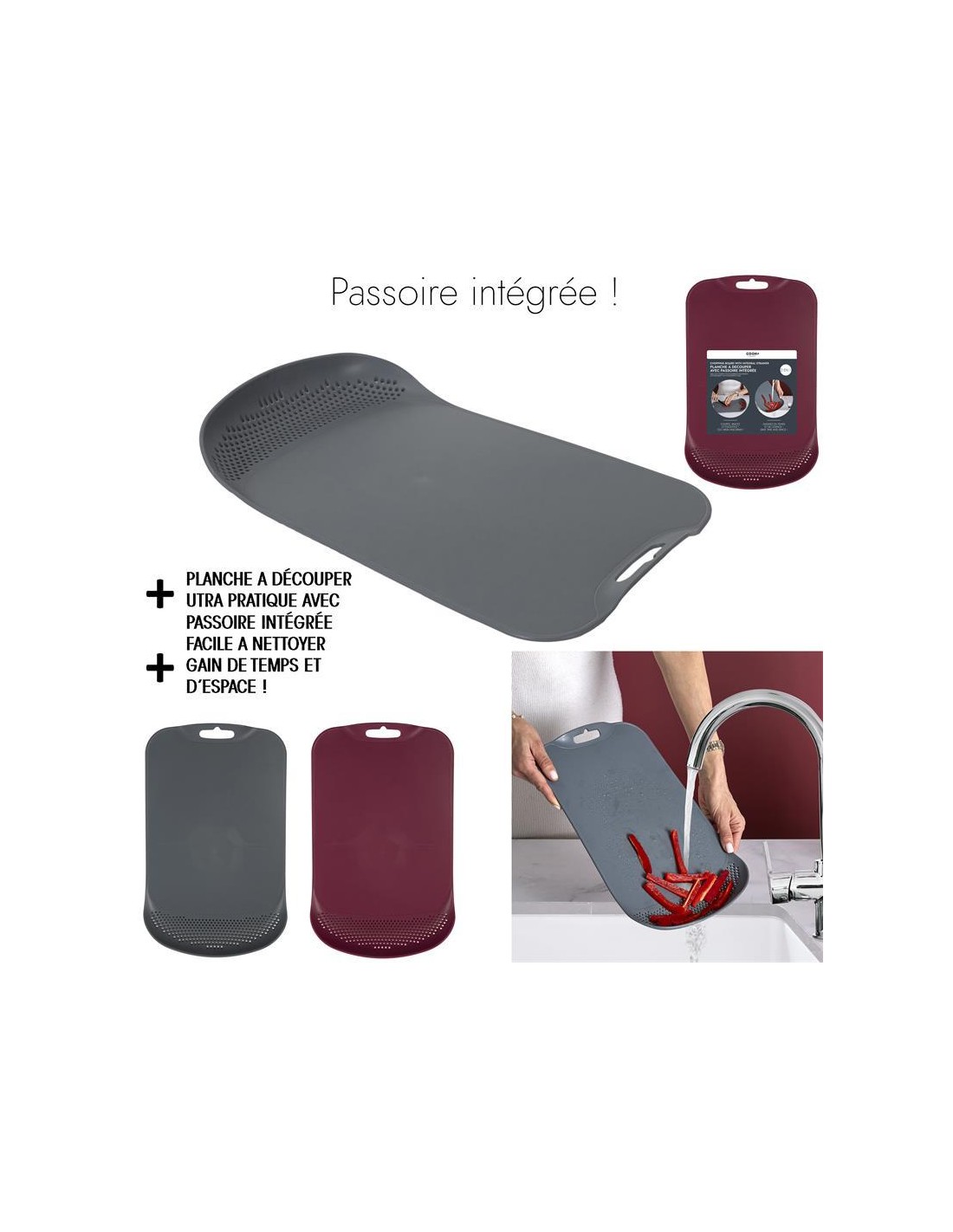 Cette planche é découper est l'acccessoire idéal pour vous aider é cuisiner : elle présente une passoire intégrée ! Format du produit 4.30 x 24 x 382 coloris disponible: bordeaux ou grisCette planche é découper est l'acccessoire idéal pour vous aider é cuisiner : elle présente une passoire intégrée ! Format du produit 4.30 x 24 x 382 coloris disponible: bordeaux ou gris